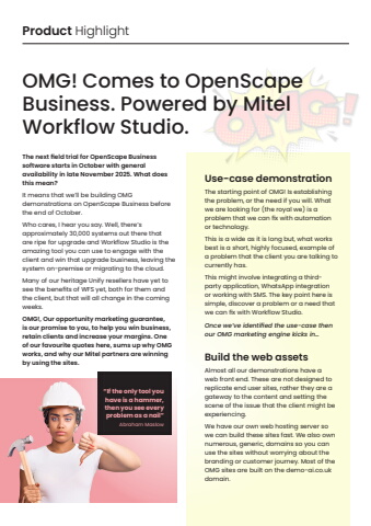 Product Highlight The next field trial for OpenScape Business software starts in October with general availability in late November 2025. What does this mean?It means that we%u2019ll be building OMG demonstrations on OpenScape Business before the end of October. Who cares, I hear you say. Well, there%u2019s approximately 30,000 systems out there that are ripe for upgrade and Workflow Studio is the amazing tool you can use to engage with the client and win that upgrade business, leaving the system on-premise or migrating to the cloud.Many of our heritage Unify resellers have yet to see the benefits of WFS yet, both for them and the client, but that will all change in the coming weeks.OMG!, Our opportunity marketing guarantee, is our promise to you, to help you win business, retain clients and increase your margins. One of our favourite quotes here, sums up why OMG works, and why our Mitel partners are winning by using the sites.OMG! Comes to OpenScape Business. Powered by Mitel Workflow Studio.Use-case demonstrationThe starting point of OMG! Is establishing the problem, or the need if you will. What we are looking for (the royal we) is a problem that we can fix with automation or technology.This is a wide as it is long but, what works best is a short, highly focused, example of a problem that the client you are talking to currently has.This might involve integrating a thirdparty application, WhatsApp integration or working with SMS. The key point here is simple, discover a problem or a need that we can fix with Workflow Studio.Once we%u2019ve identified the use-case then our OMG marketing engine kicks in%u2026Build the web assetsAlmost all our demonstrations have a web front end. These are not designed to replicate end user sites, rather they are a gateway to the content and setting the scene of the issue that the client might be experiencing.We have our own web hosting server so we can build these sites fast. We also own numerous, generic, domains so you can use the sites without worrying about the branding or customer journey. Most of the OMG sites are built on the demo-ai.co.uk domain.%u201cIf the only tool you have is a hammer, then you see every problem as a nail%u201dAbraham Maslow