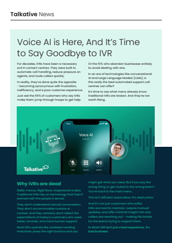 Why IVRs are deadStatic menus. Rigid flows. Impersonal scripts. Traditional IVRs rely on technology that hasn%u2019t evolved with the people it serves.They don%u2019t understand natural conversation. They don%u2019t accommodate nuance or context. And they certainly don%u2019t reflect the expectations of today%u2019s customers who want faster, smarter, and more human support.Most IVRs operate like outdated vending machines: press the right buttons and you might get what you need. But if you say the wrong thing or get routed to the wrong team? You%u2019re back to the main menu.This isn%u2019t efficient automation. It%u2019s obstruction.And it%u2019s not just customers who suffer. IVRs are hard to maintain, require manual updates, and offer minimal insight into why callers are reaching out - making life harder for the teams trying to support them.In short: IVR isn%u2019t just a bad experience. It%u2019s bad business.Talkative News Voice AI is Here, And It%u2019s Time to Say Goodbye to IVRFor decades, IVRs have been a necessary evil in contact centres. They were built to automate call handling, reduce pressure on agents, and route callers quickly. In reality, they%u2019ve done quite the opposite - becoming synonymous with frustration, inefficiency, and a poor customer experience.Just ask the 55% of customers who say IVRs make them jump through hoops to get help. Or the 51% who abandon businesses entirely to avoid dealing with one.In an era of technologies like conversational AI and Large Language Models (LLMs), is this really the best automated support call centres can offer?It%u2019s time to say what many already kno traditional IVRs are broken. And they%u2019re not worth fixing.