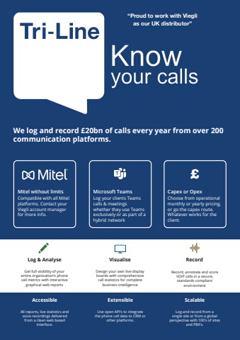 We log and record %u00a320bn of calls every year from over 200 communication platforms. Compatible with all Mitel platforms. Contact your Viegli account manager for more info.Mitel without limits Microsoft Teams Capex or OpexLog your clients Teams calls & meetings whether they use Teams exclusively or as part of a hybrid networkChoose from operational monthly or yearly pricing, or go the capex route. Whatever works for the client.%u00a3Log & Analyse Visualise RecordGet full visibility of your entire organization%u2019s phone call metrics with interactive graphical web reportsDesign your own live display boards with comprehensive call statistics for complete business intelligenceRecord, annotate and score VOIP calls in a secure, standards-compliant environmentAccessibleAll reports, live statistics and voice recordings delivered from a clean web based interface.AccessibleExtensibleUse open API%u2019s to integrate the phone call data to CRM or other platforms.ScalableLog and record from a single site or from a global perspective with 100%u2019s of sites and PBX%u2019s.%u201cProud to work with Viegli as our UK distributor%u201d