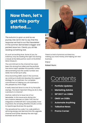 It%u2019s such an exciting time. Some of you, for instance, may be reading this right now during a break at the Mitel partner event at the British Motor Museum.The commitment to the channel has never been this strong from Mitel and the portfolio has some major updates this quarter, further demonstrating how the worlds number one really has turned up to play.Since launching OMG!, back in the summer, we continue to build and develop the support strategy for our partners. Our complete commitment to helping you win business is why people buy from Viegli.It really does boil down to one of my favourite sayings, %u201cthe least important thing we do is ship a product or a licence%u201d.Anyhow, welcome to issue two of our Newsletter. In this issue we%u2019re diving into two massive releases on Osbiz. First, the full integration of Mitel SIP DECT and possibly more important, the amazing Workflow Studio comes to OpenScape Business this quarter.The sensational low code / no code platform will bring energy and demand into the upgradechannel and further develop the new logo business we all crave.There%u2019s a host of promos out there too, making you more money and helping win new business.Enjoy!Robert NunnThe autumn is upon us and as we journey into Q4 it%u2019s fair to say that the response we had to our first Newsletter in the summer demanded a bigger and packed issue two. Clearly you all like reading something real.4681012 1618Portfolio UpdatesMarketing AdviceSIP DECT on OSBizOMG! on OSBizAutomate AnythingTalkative NewsPromo CornerContentsNow then, let%u2019s get this party started....